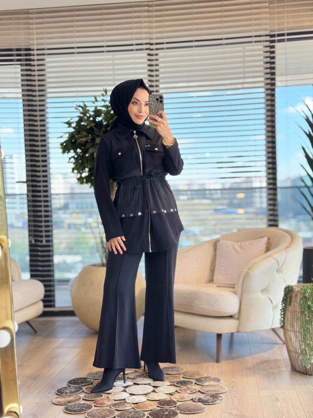 02-2660 Ön Çizgili Ve Cepli Fermuarlı Takım Siyah