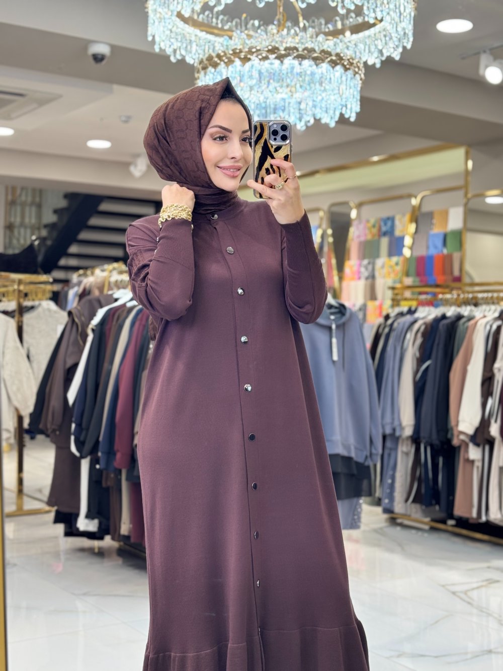 048 Eteği Volanlı Çıtçıtlı Uzun Hırka Kahve