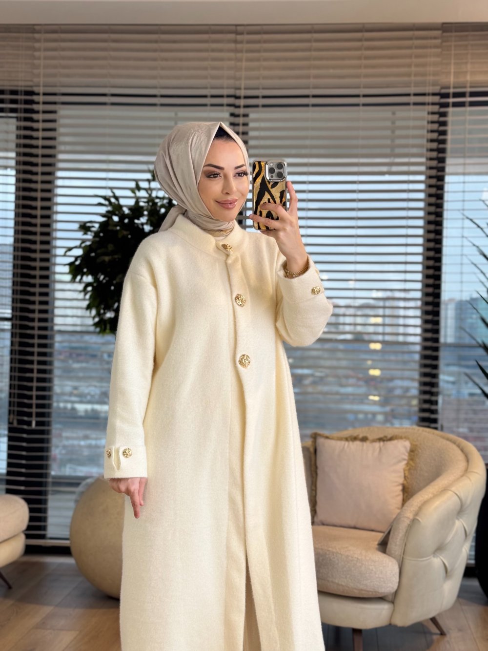 080 Angora Patı Ve Manşeti Düğmeli Kap Ekru