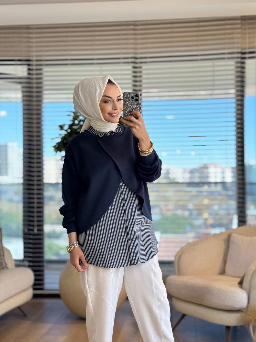 10725 Çizgili Gömlek Üstü Bluzlu Tunik Lacivert