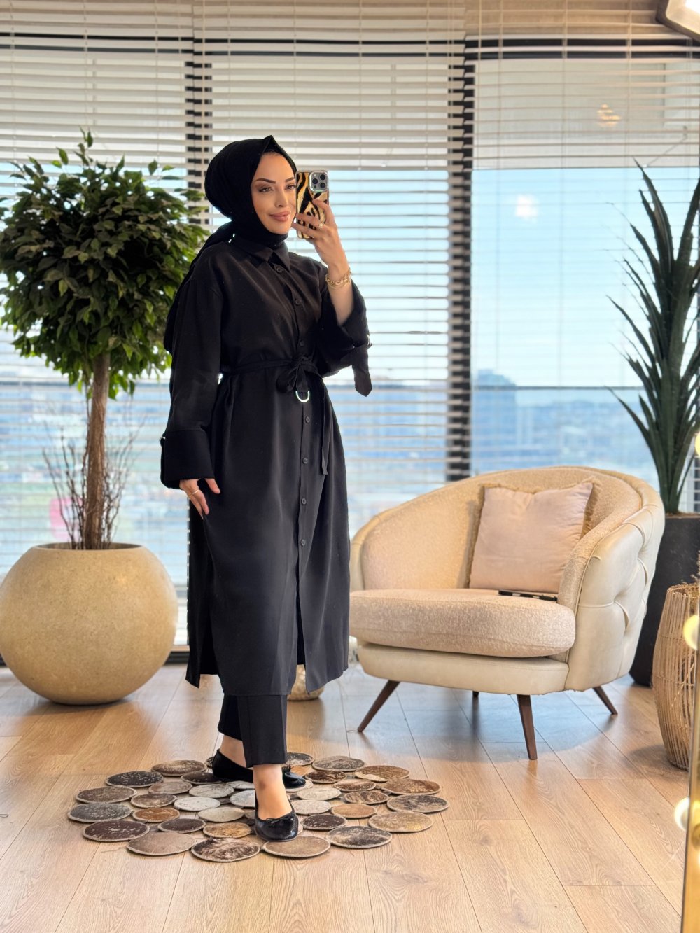 10753 Manşeti Kuşaklı Uzun Ön Düğmeli Tunik Siyah