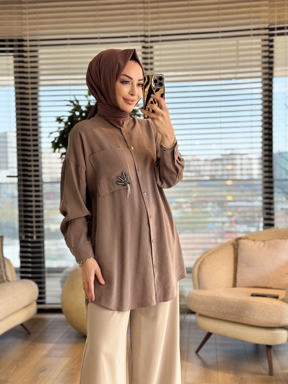 10763 Cep Üstü Broş İşli Gömlek Vizon