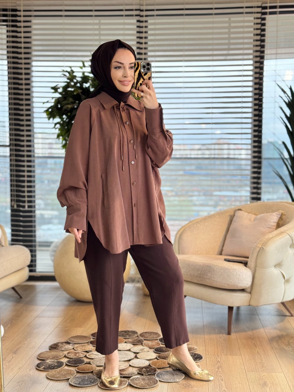10772 Yakası İp Bağcıklı Gömlek Kahve