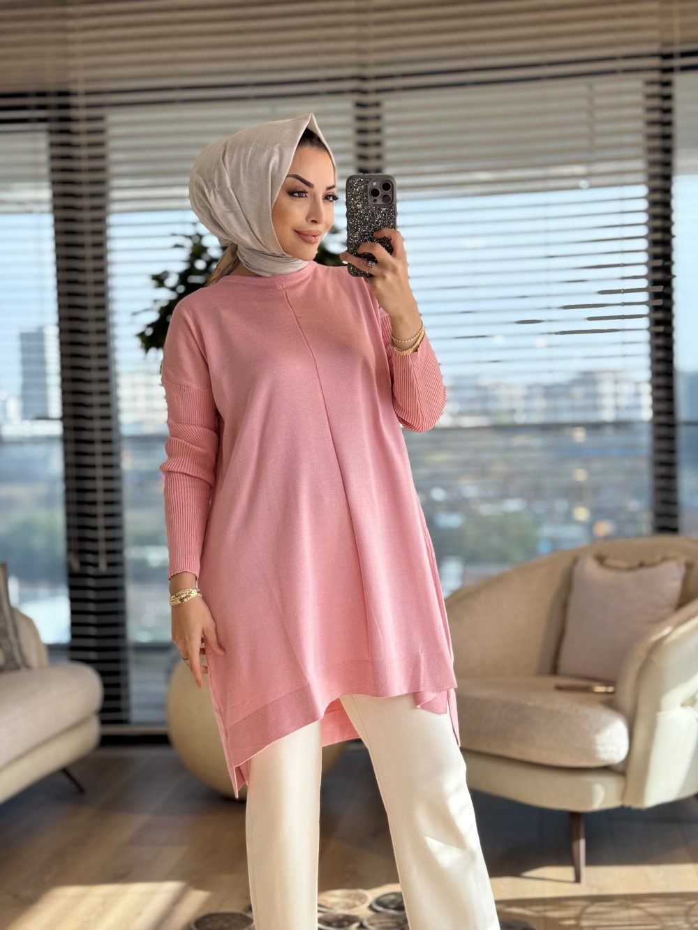 127 Kolları Lastik Örgü Triko Tunik Pembe