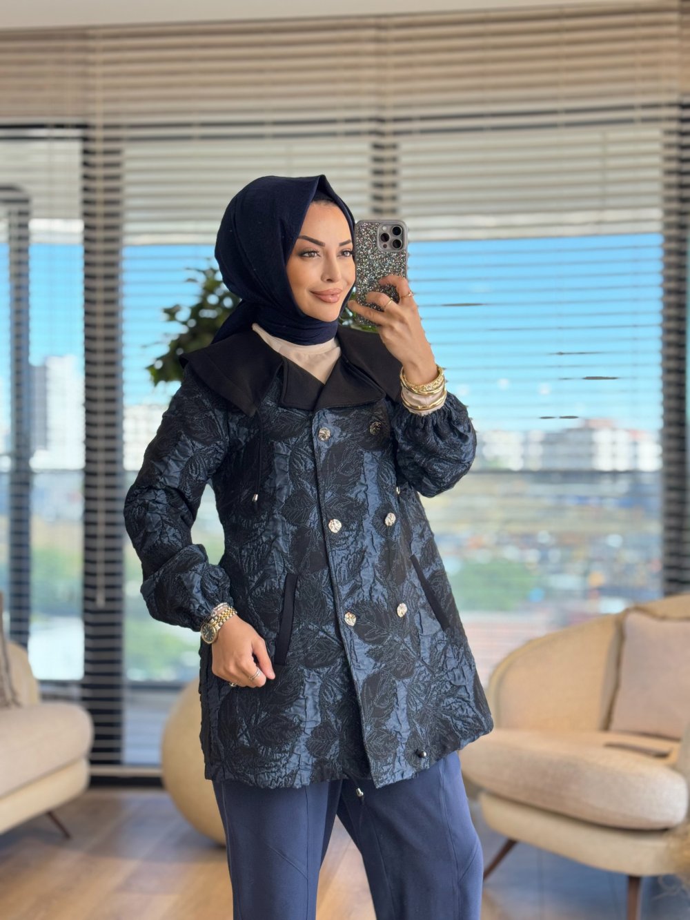 14-1159 Kabartma Desenli Altı Düğmeli Ceket İndigo