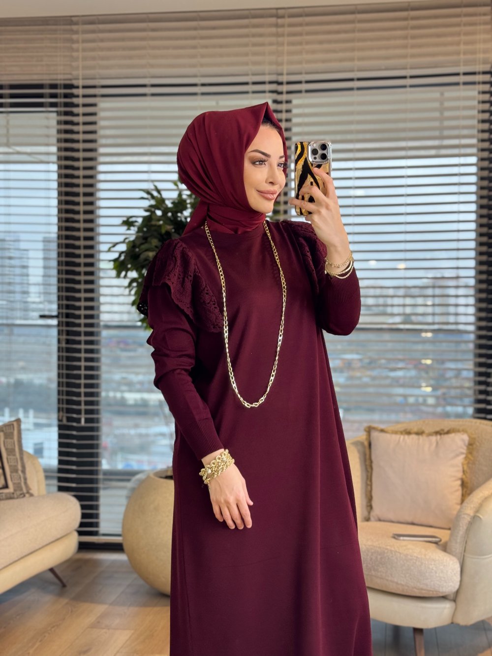 143 Omzu Dantel Detaylı Triko Elbise Bordo