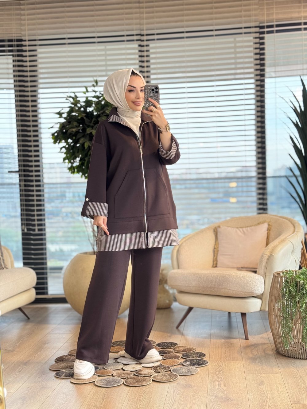 14383 Etek Ucu Ve Manşeti Çizgili Takım Kahve