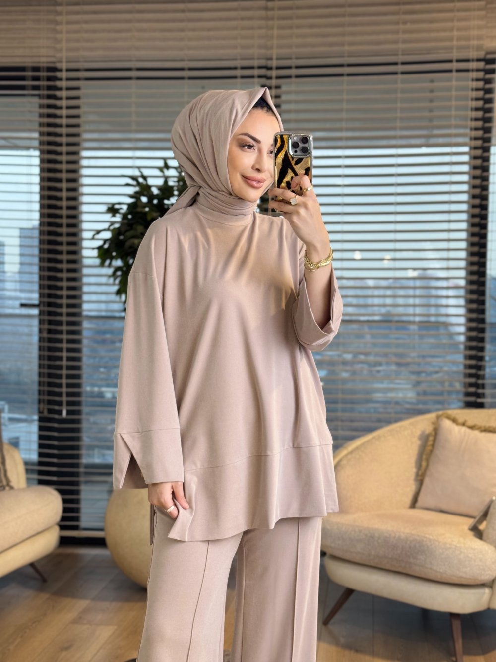 14457 Etek Ucu Parça Yırtmaçlı Takım Bej
