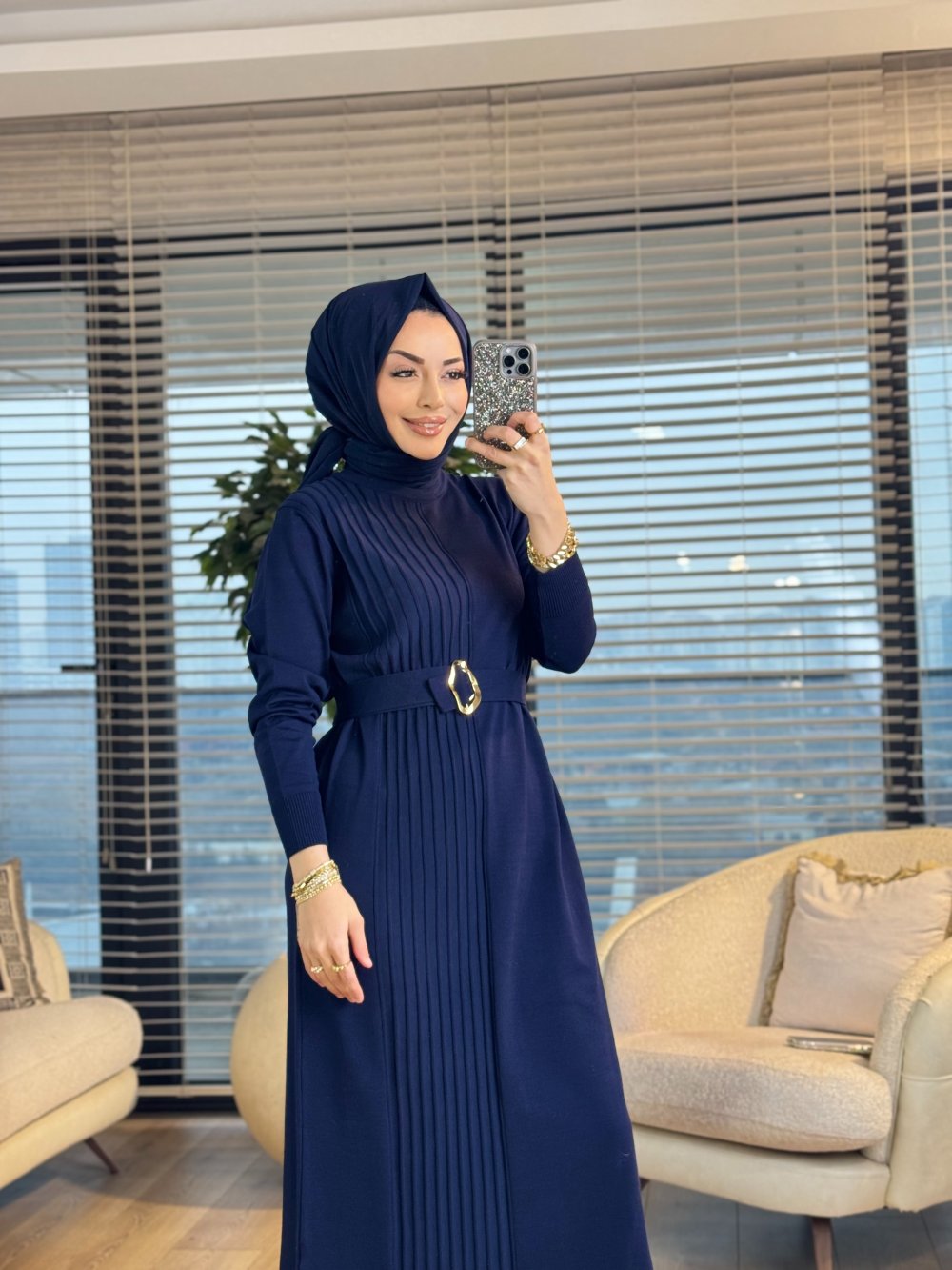 146 Sol Arka Ön Şeritli Triko Elbise Lacivert