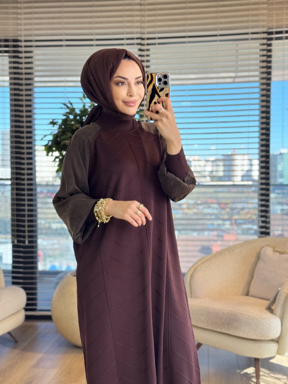 148 Ön V Dikişli Kolu Kumaş Triko Elbise Kahve