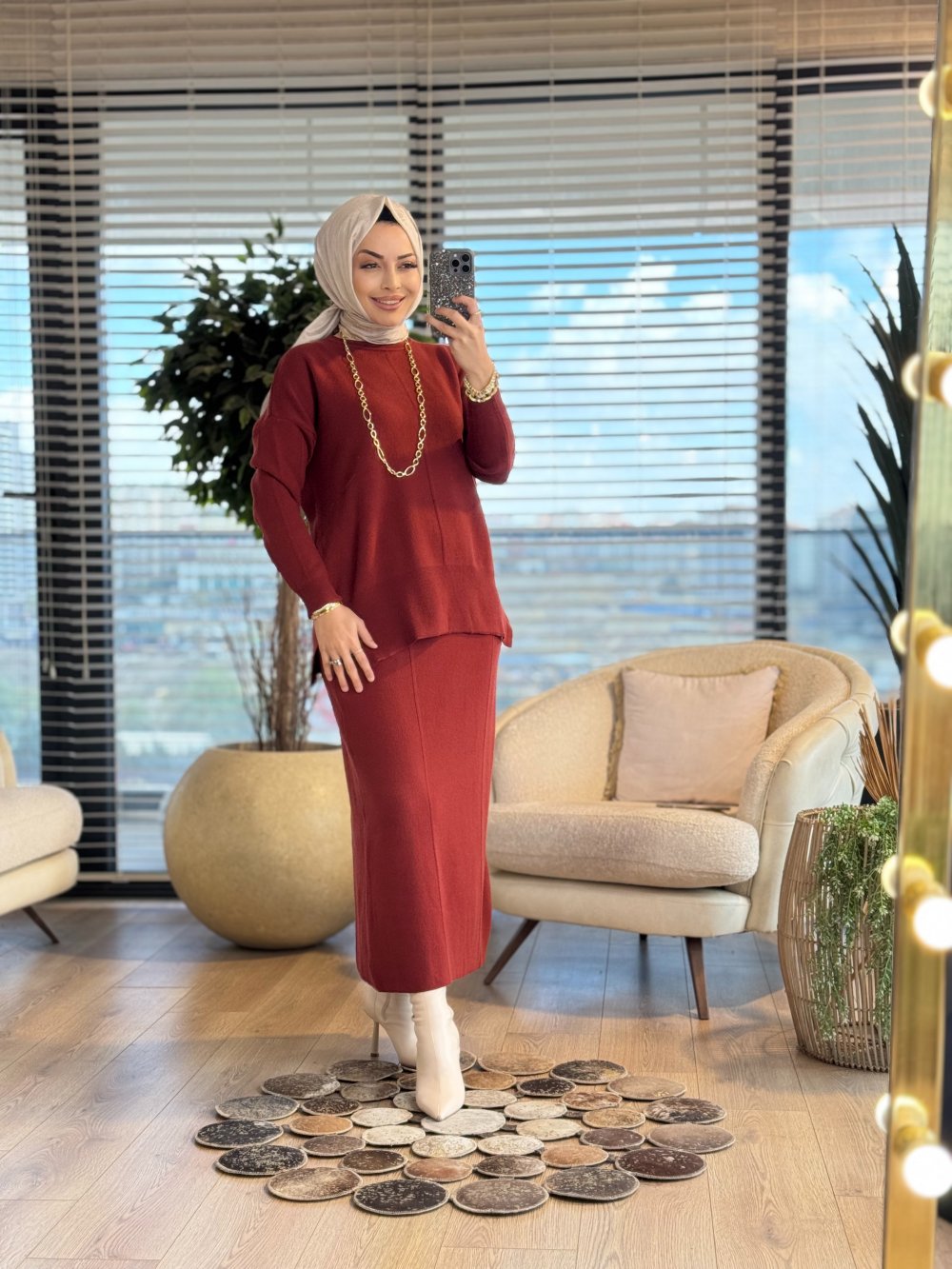 14900-1 Ön Tek Çizgili Triko Etekli Takım Kiremit