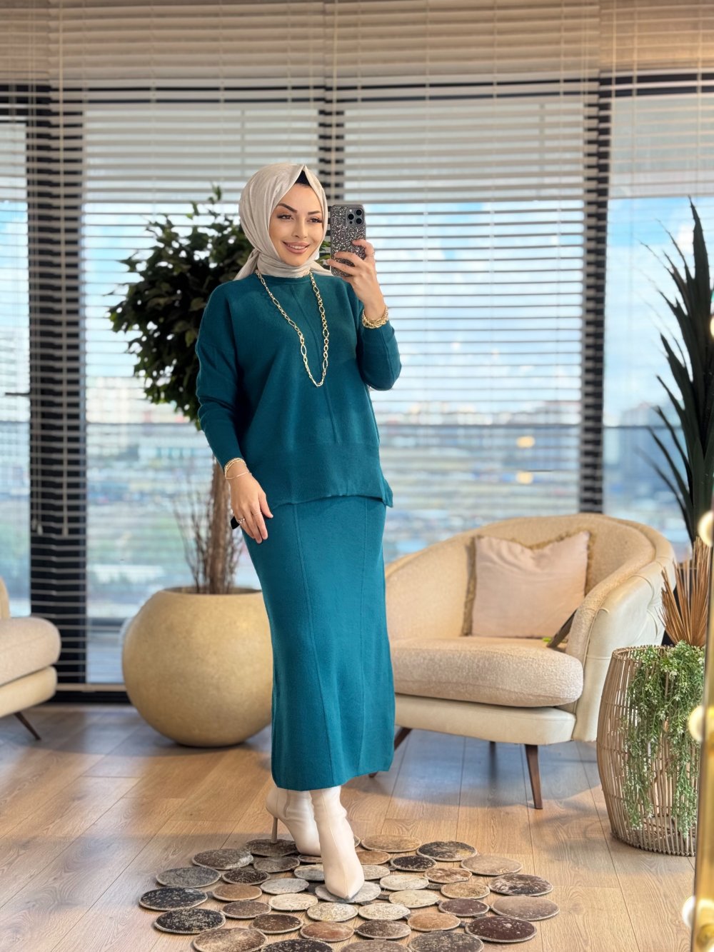 14900-1 Ön Tek Çizgili Triko Etekli Takım Petrol