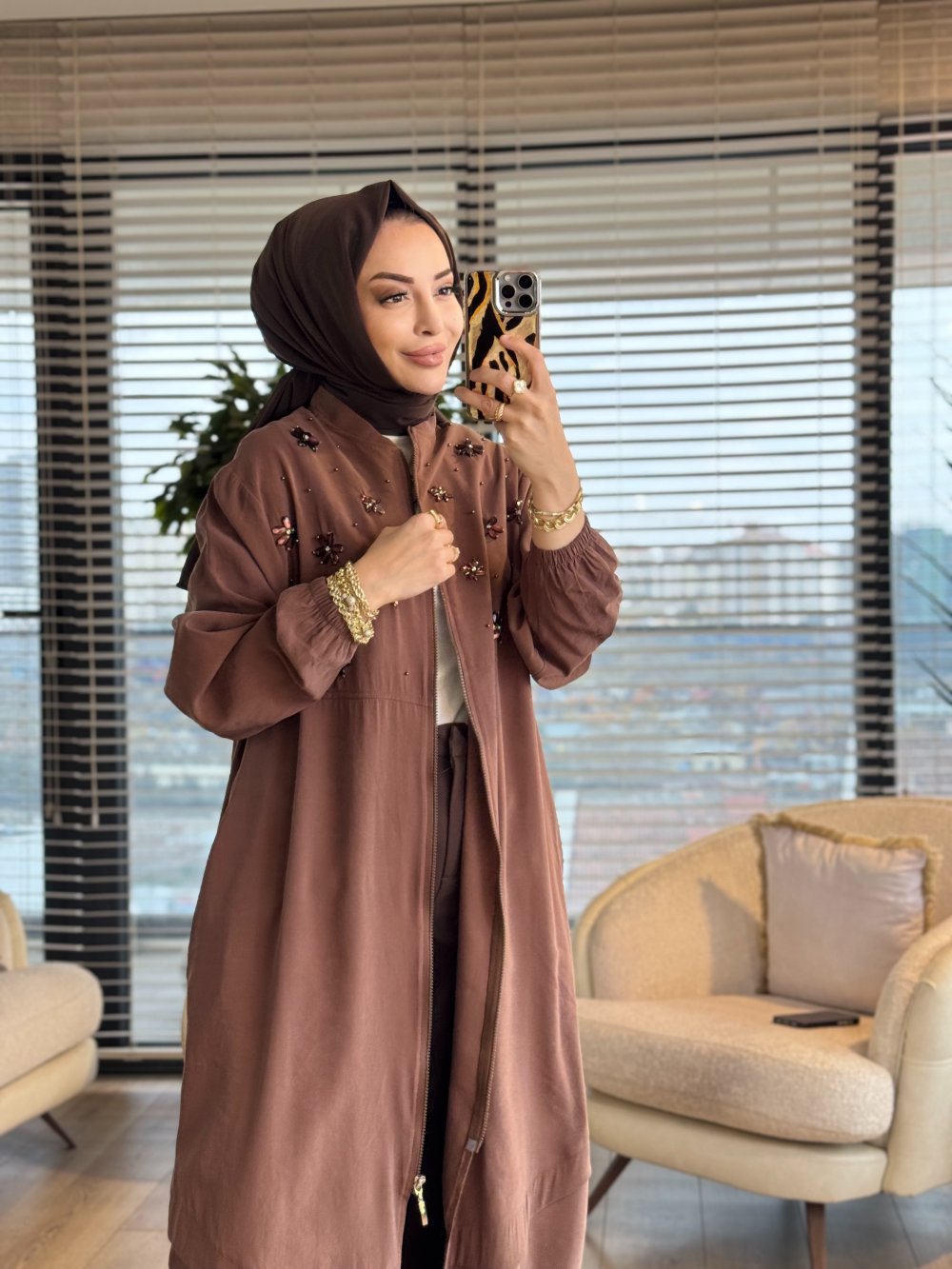 15253 Ön Taş Çiçek İşleme Cepli Fermuarlı Kap Kahve