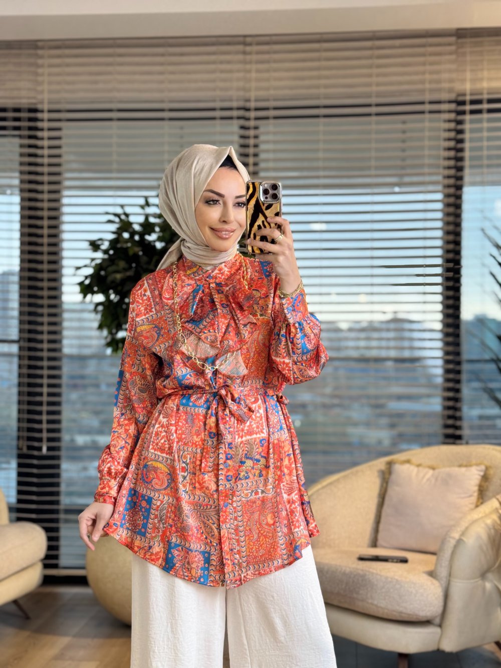 2033-1 Kumsal Pano Desen Tunik Oranj