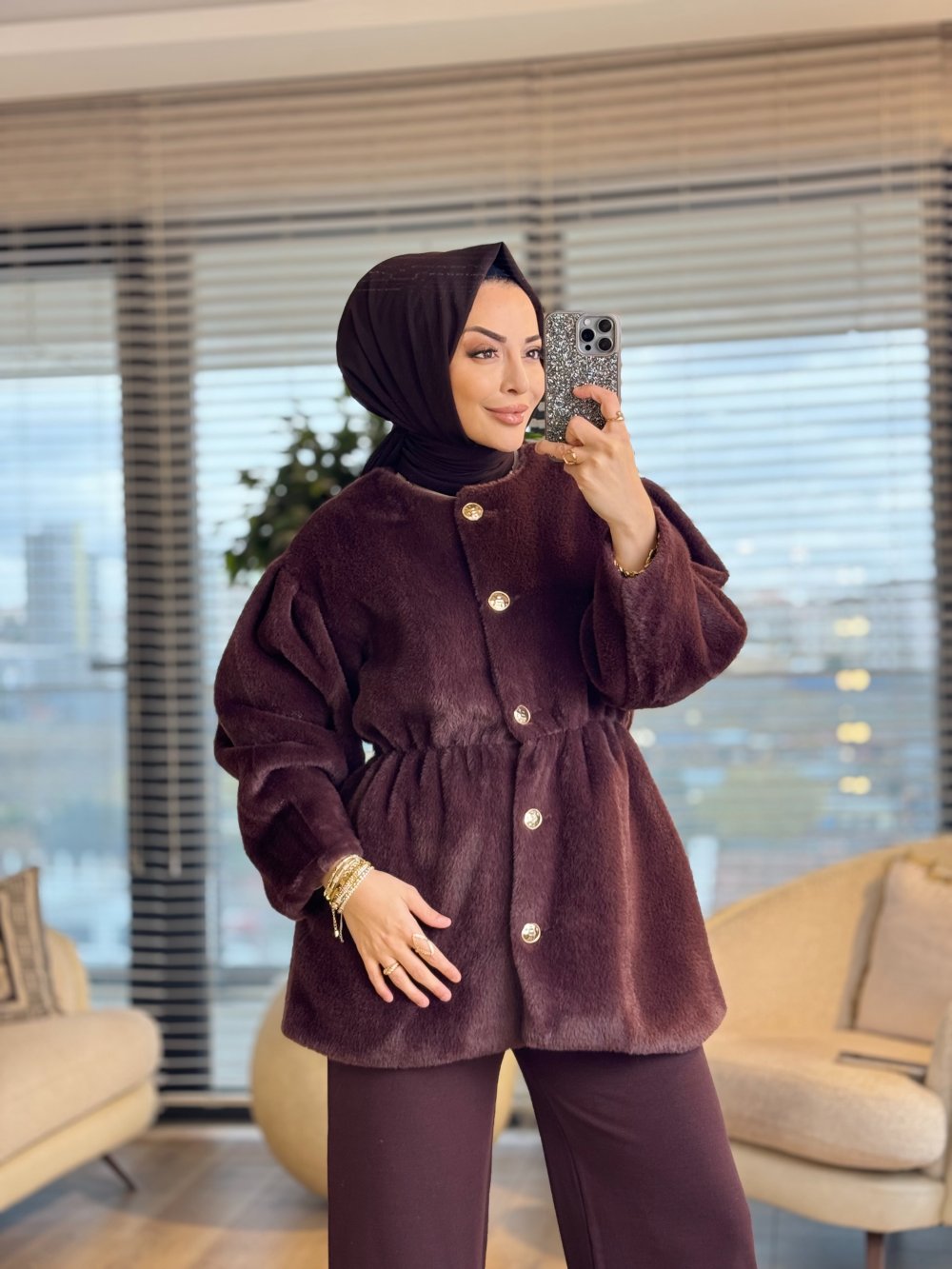 20723 Angora Yakasız Ön Metal Düğmeli Kaban Kahve