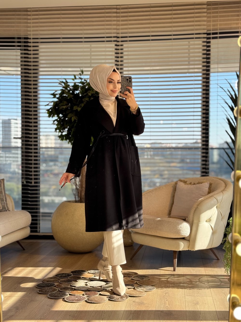 2189 Kaşe Deri Kemerli Uzun Kaban Siyah