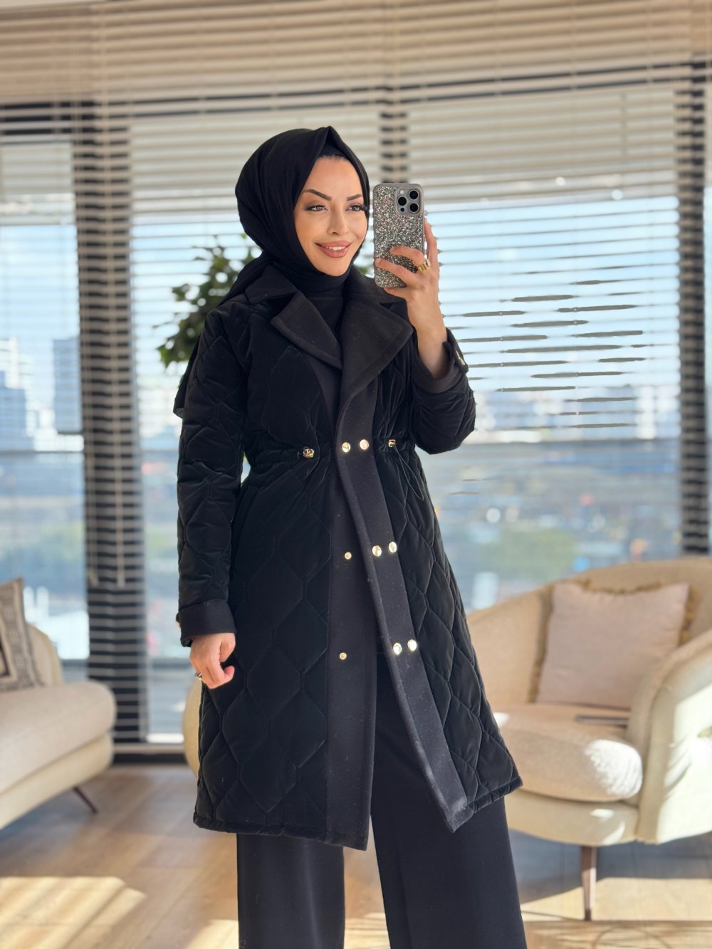 2208-1 Kapitone Kaşe Garnili Uzun Kaban Siyah