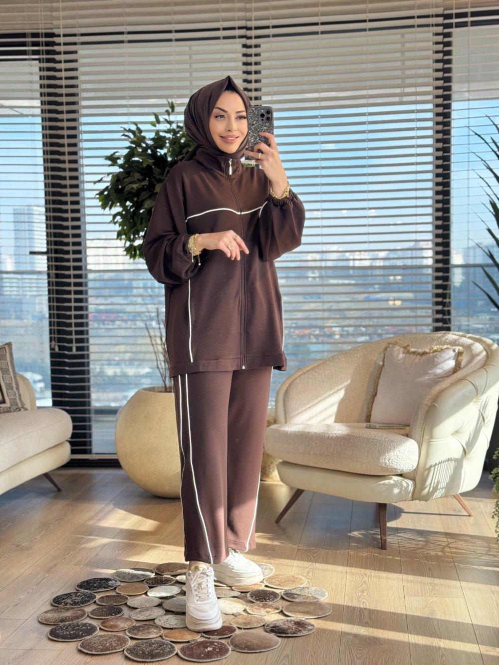 22755 Ön Kol Ve Pantolon Yanı Biye Detaylı Takım Kahve