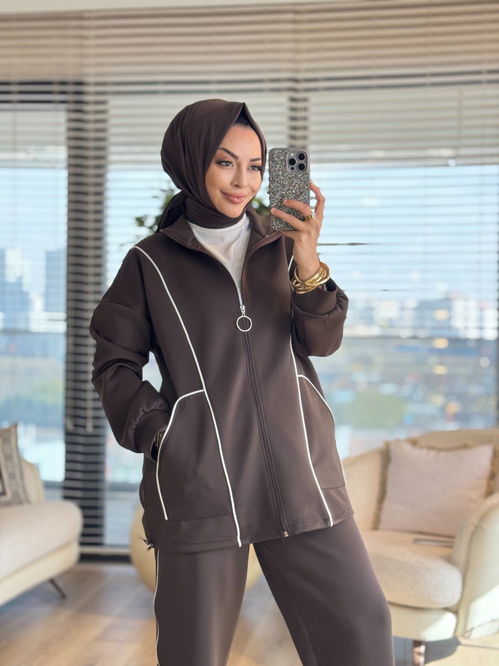 22763 Biye Detaylı Önü Fermuarlı Takım Kahve