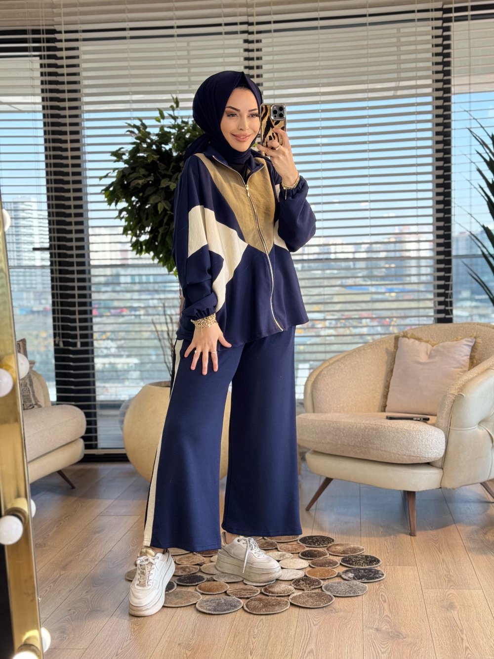 22836 Önü Renkli Parçalı Fermuarlı Takım Lacivert