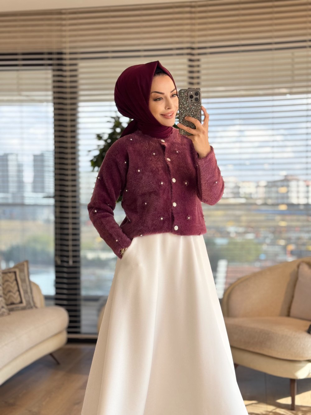 2408 Angora Üstü Taş İşlemeli Hırka Mürdüm