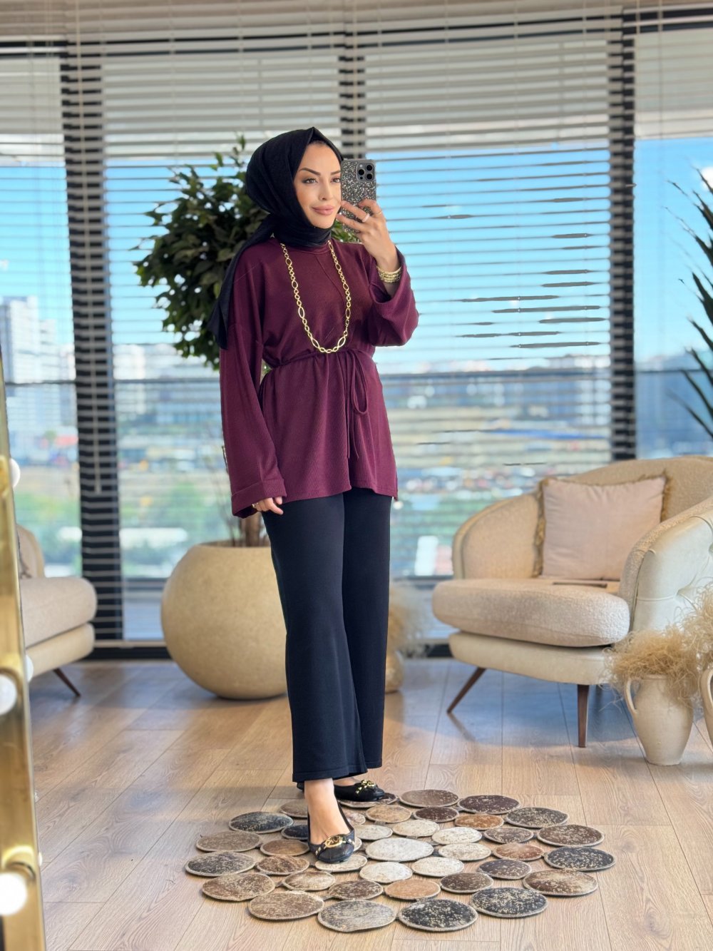 24357 Kendinden Çizgili Kolu Katlamalı Tunik Mürdüm