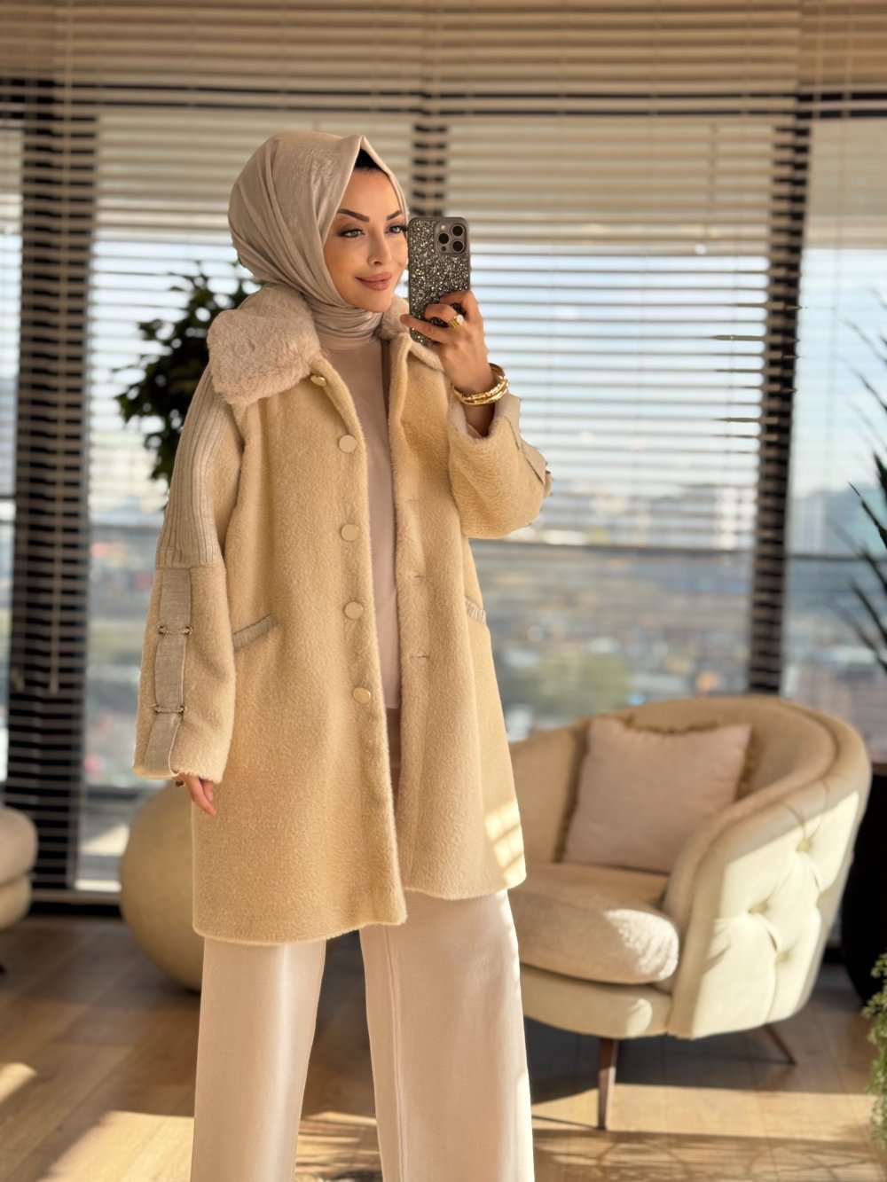 2461 Kolları Trikolu Peluş Kaban Bej
