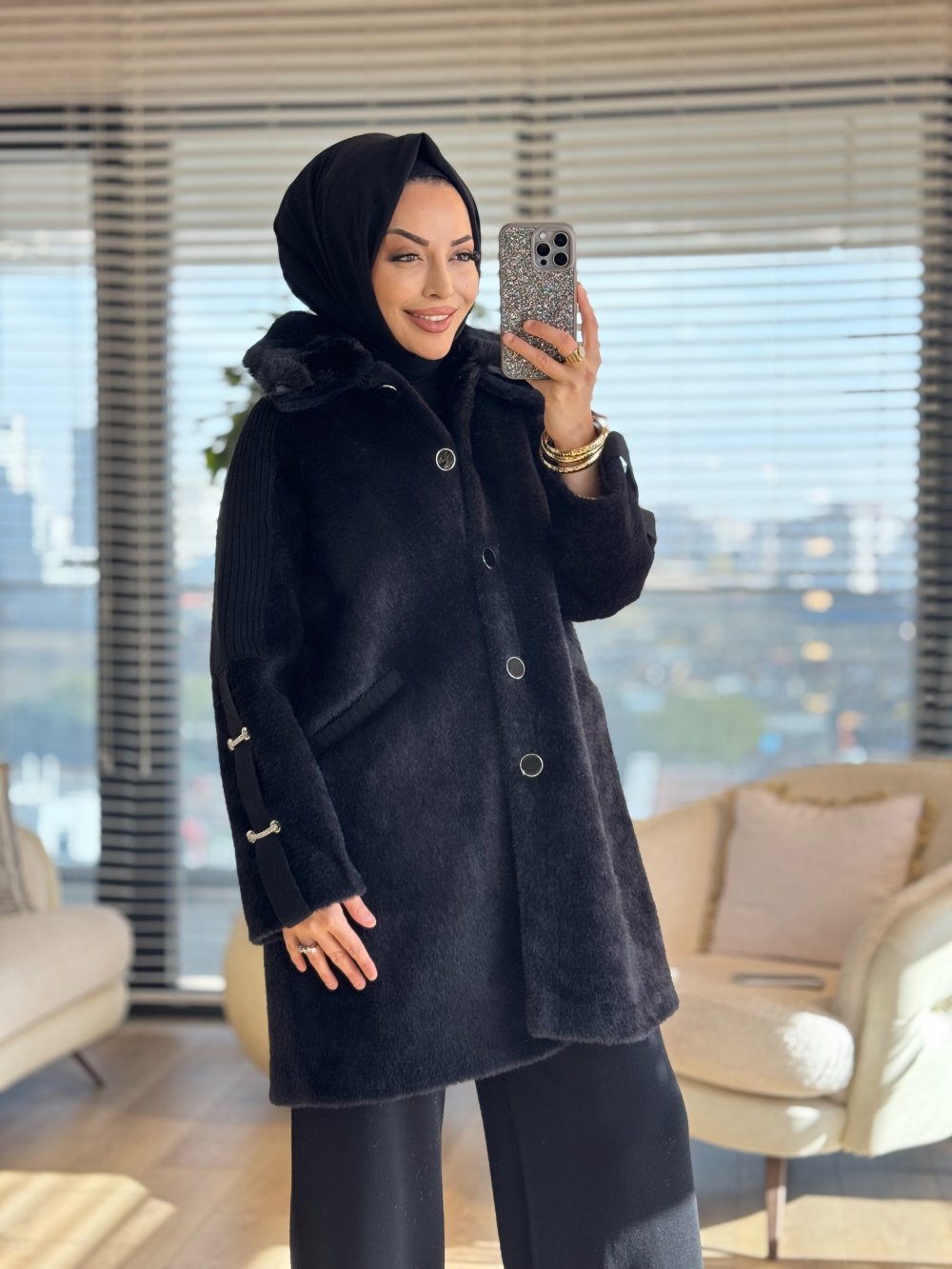 2461 Kolları Trikolu Peluş Kaban Siyah