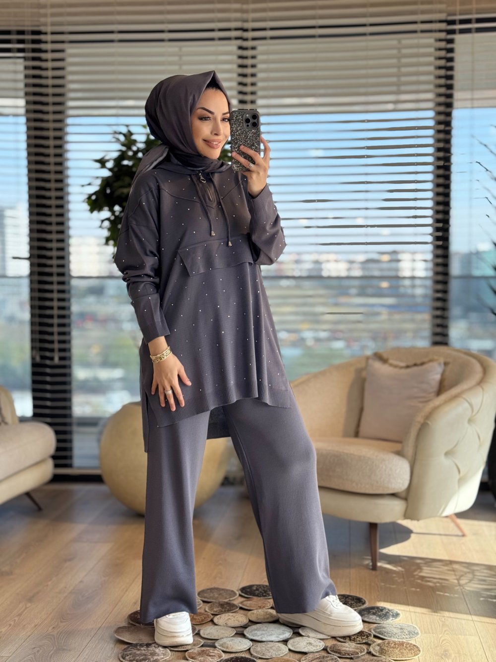 2569 Kanguru Cepli Taş Baskılı Triko Takım Antrasit