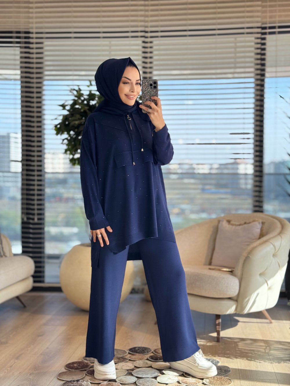 2569 Kanguru Cepli Taş Baskılı Triko Takım Lacivert