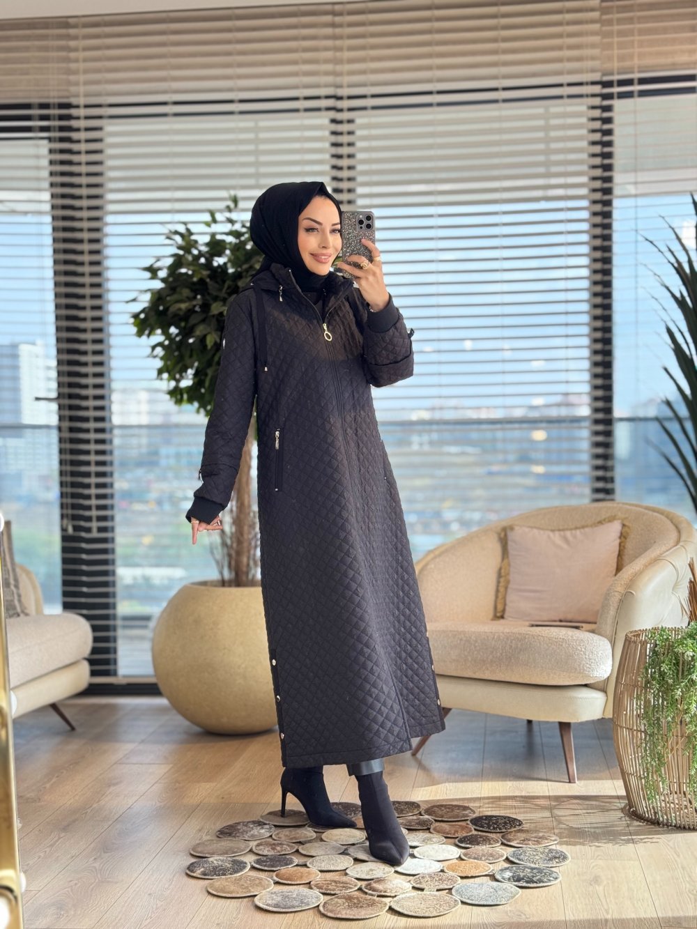 2578 Kraş Kapitoneli Kapşonlu Kaban Siyah
