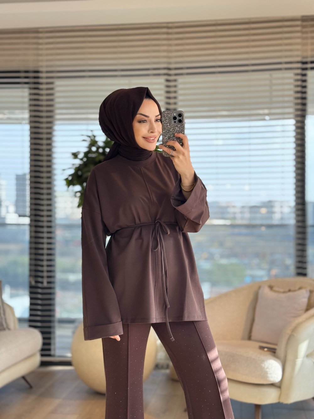 2755 Dikiş Detaylı Yırtmaçlı Sweat Koyu Kahve