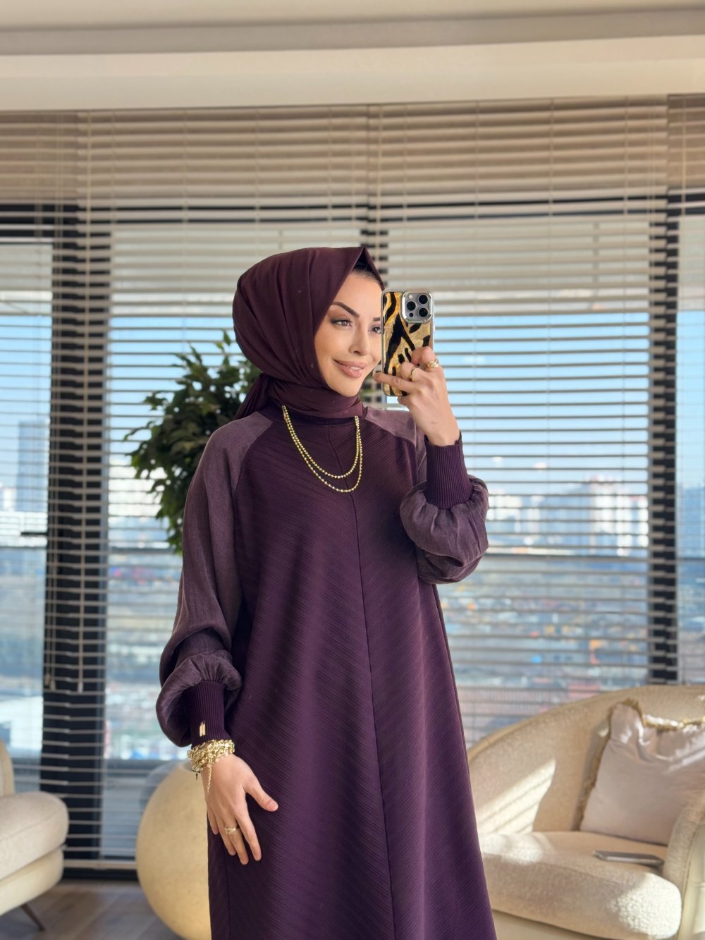 282 Ön Arka V Örgülü Kolları Kupra Elbise Mürdüm