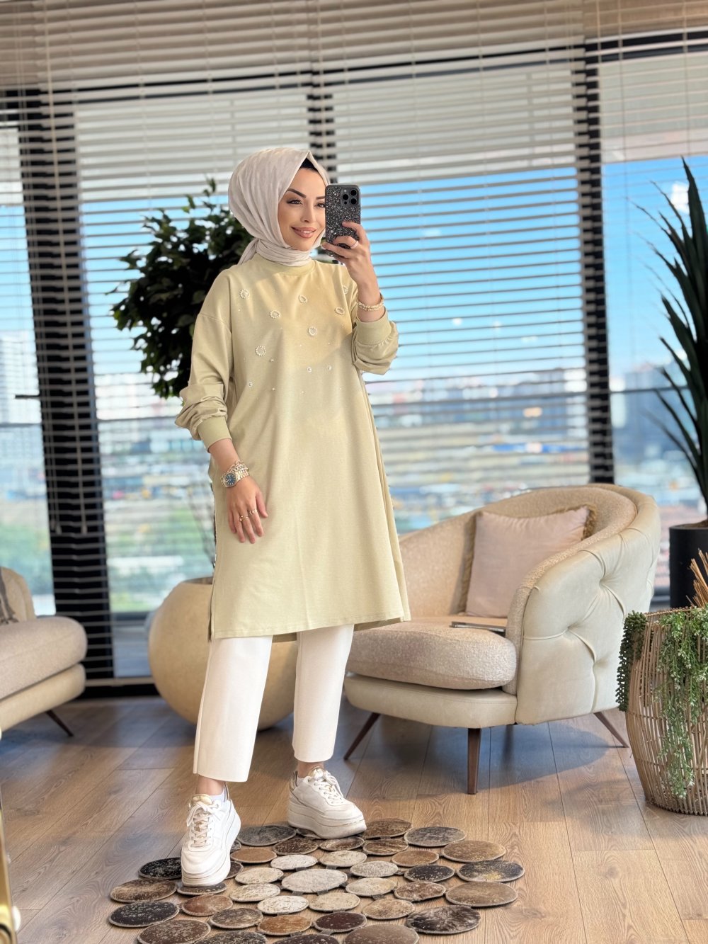 3138 Taş Ve İnci Detaylı Midi Boy SweatShirt Çağla