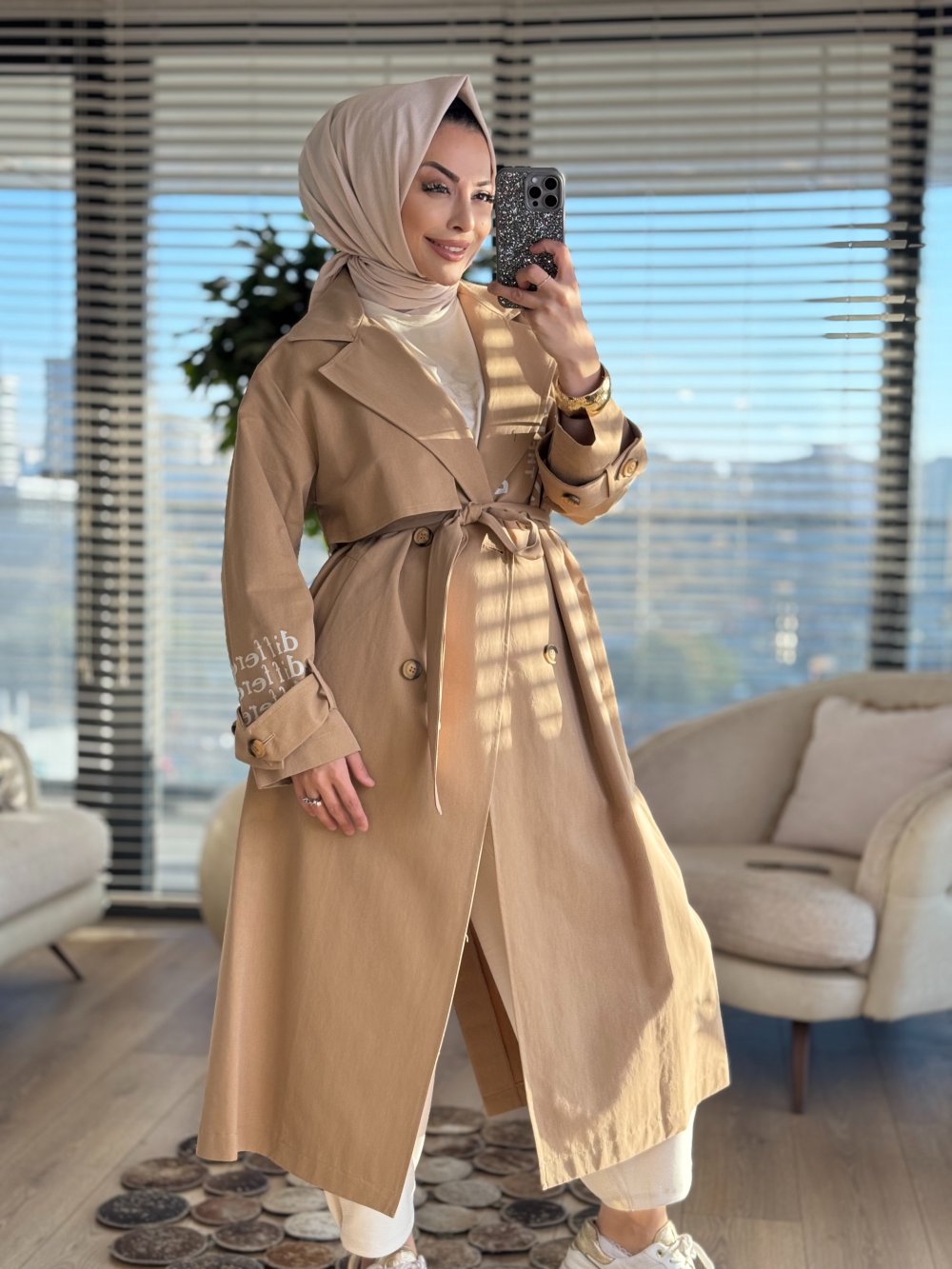 32139 Ön Arka Kol Yazı Baskılı Trenç Camel