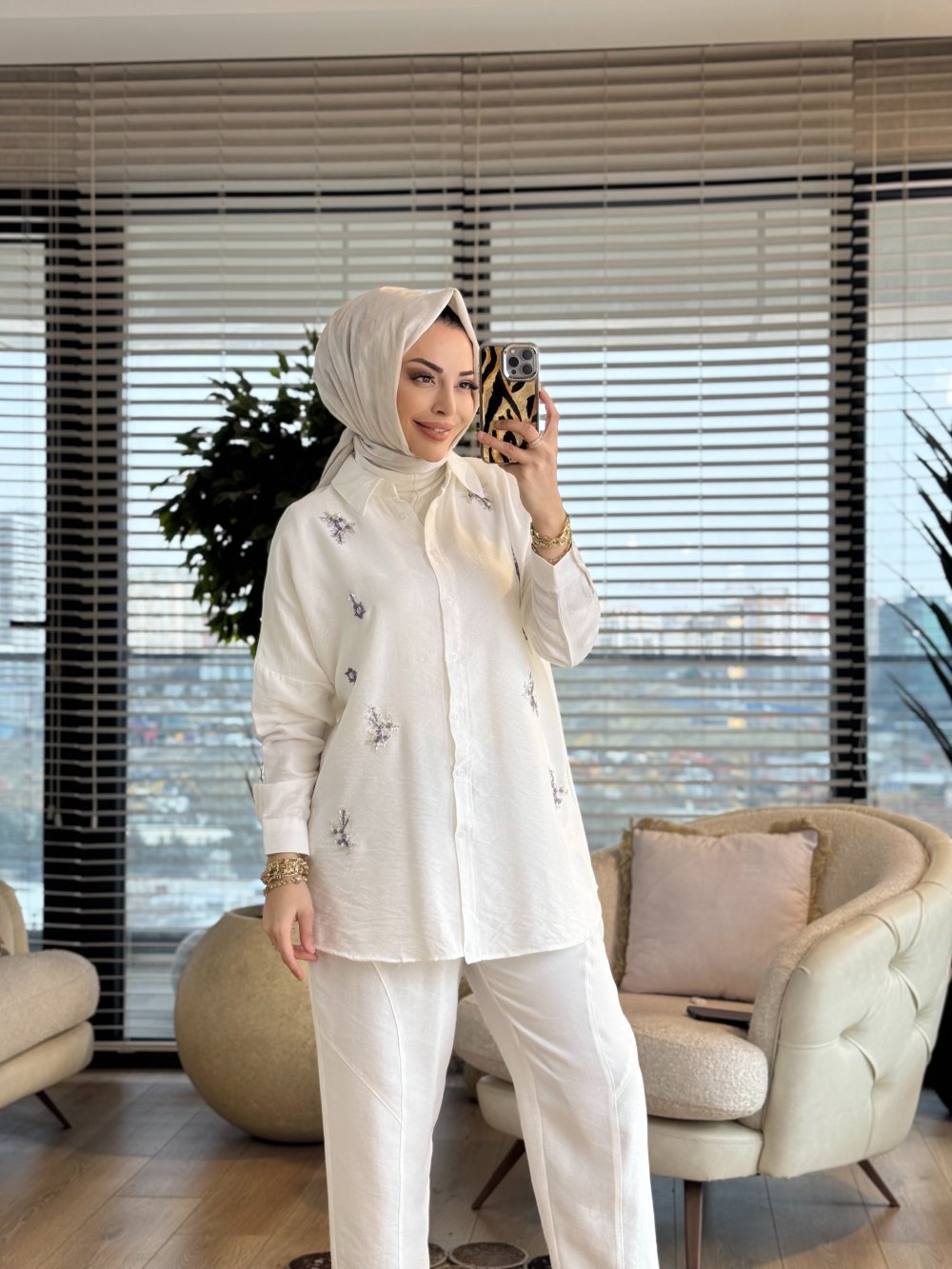 3228 Kristal Taş Detaylı Gömlek Ekru