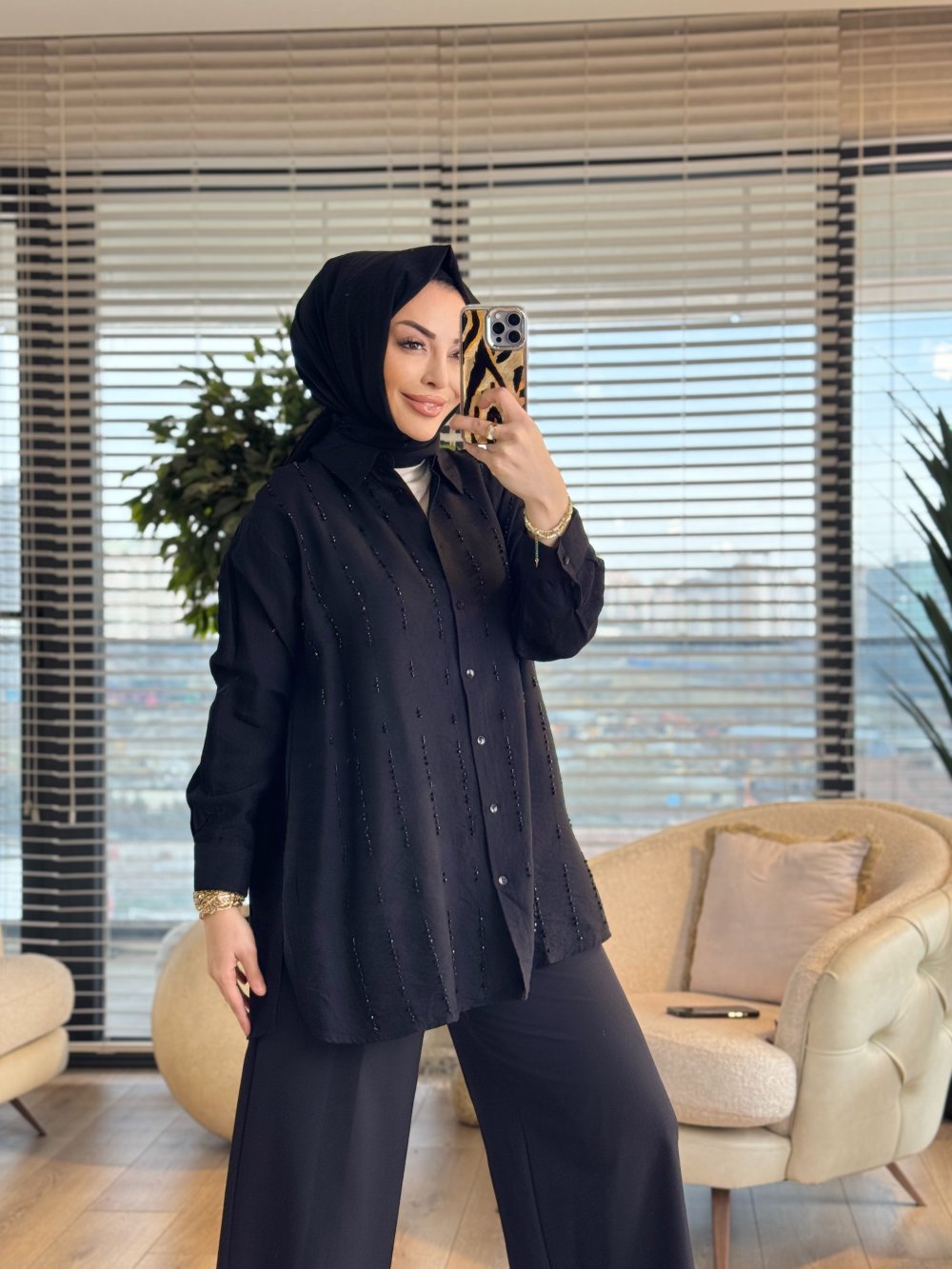 3245 Sarkıt Boncuk İşlemeli Gömlek Siyah