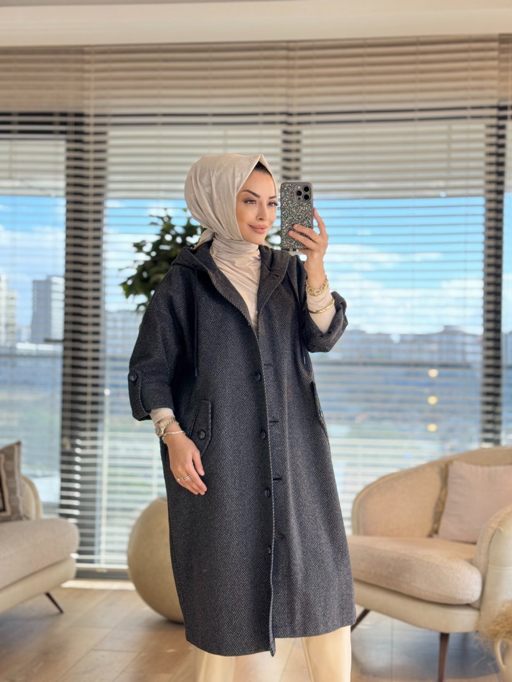33424 Balıksırtı Cepli Kapşonlu Kaban Siyah