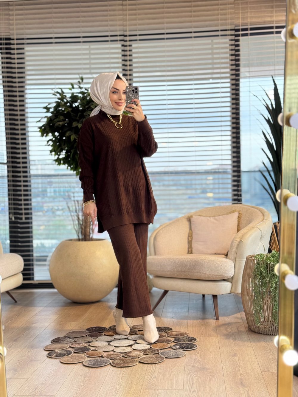 3444 Nopen Fitilli Triko Pantolon Takım Kahve