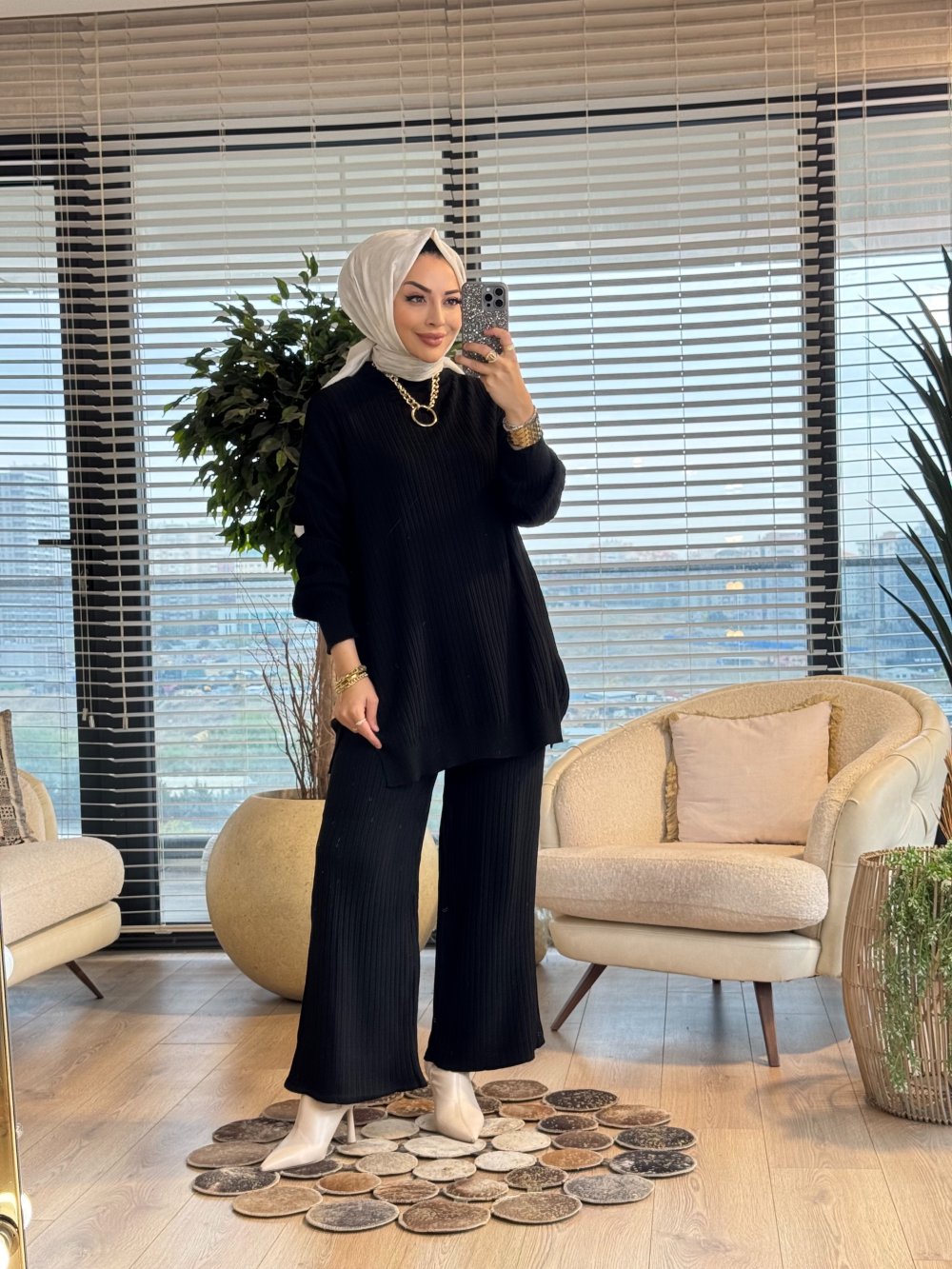 3444 Nopen Fitilli Triko Pantolon Takım Siyah