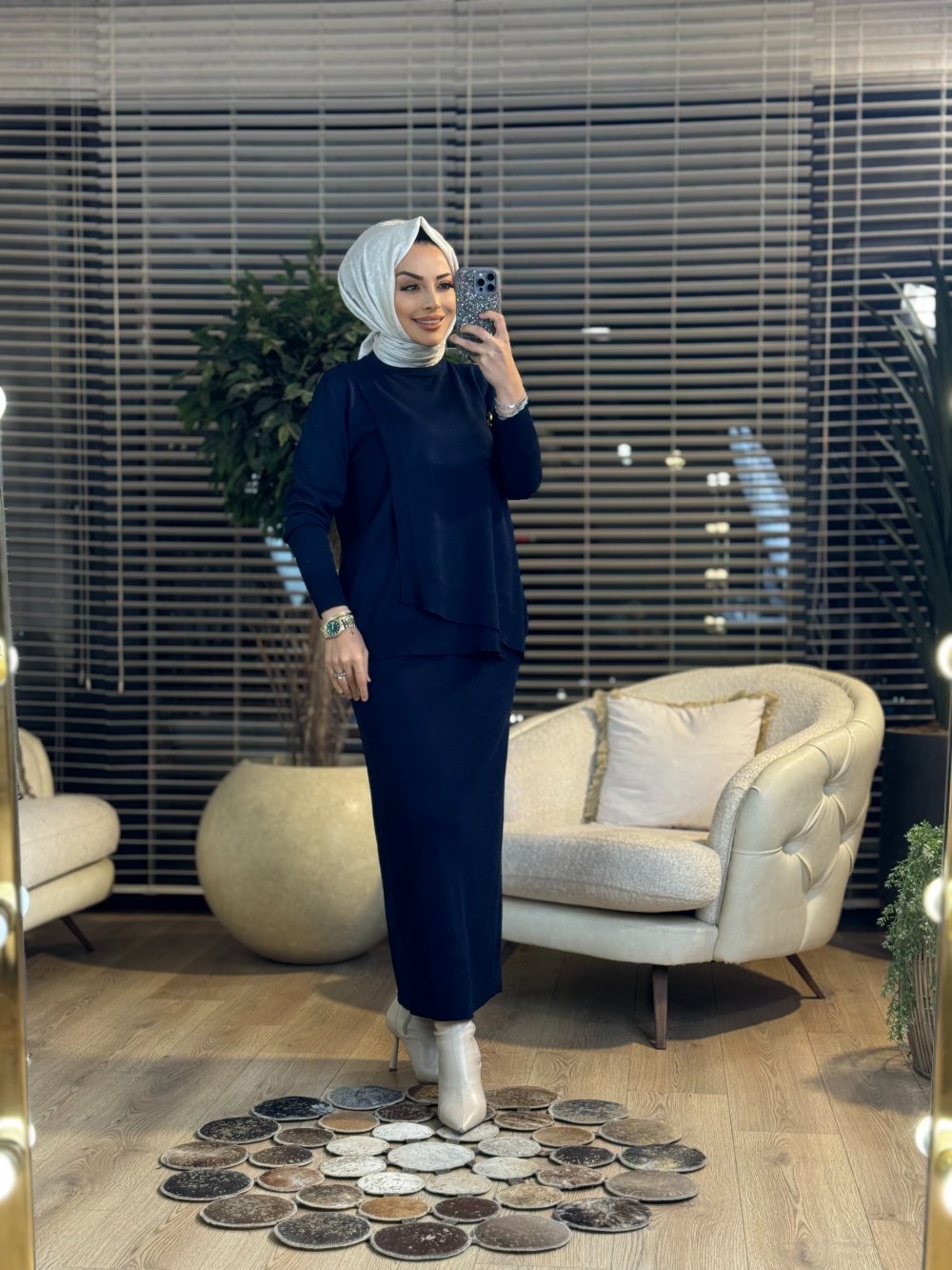 3561 Ön Parçalı Broşlu Triko Etekli Takım Lacivert