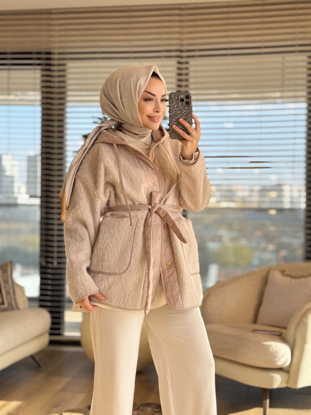 35634 Kapitone Garnili Peluş Mont Bej