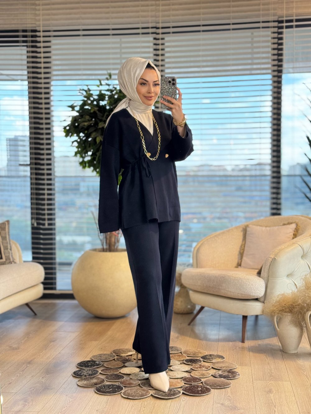 35881 Kruvaze Düğmeli Triko Pantolonlu Takım Siyah