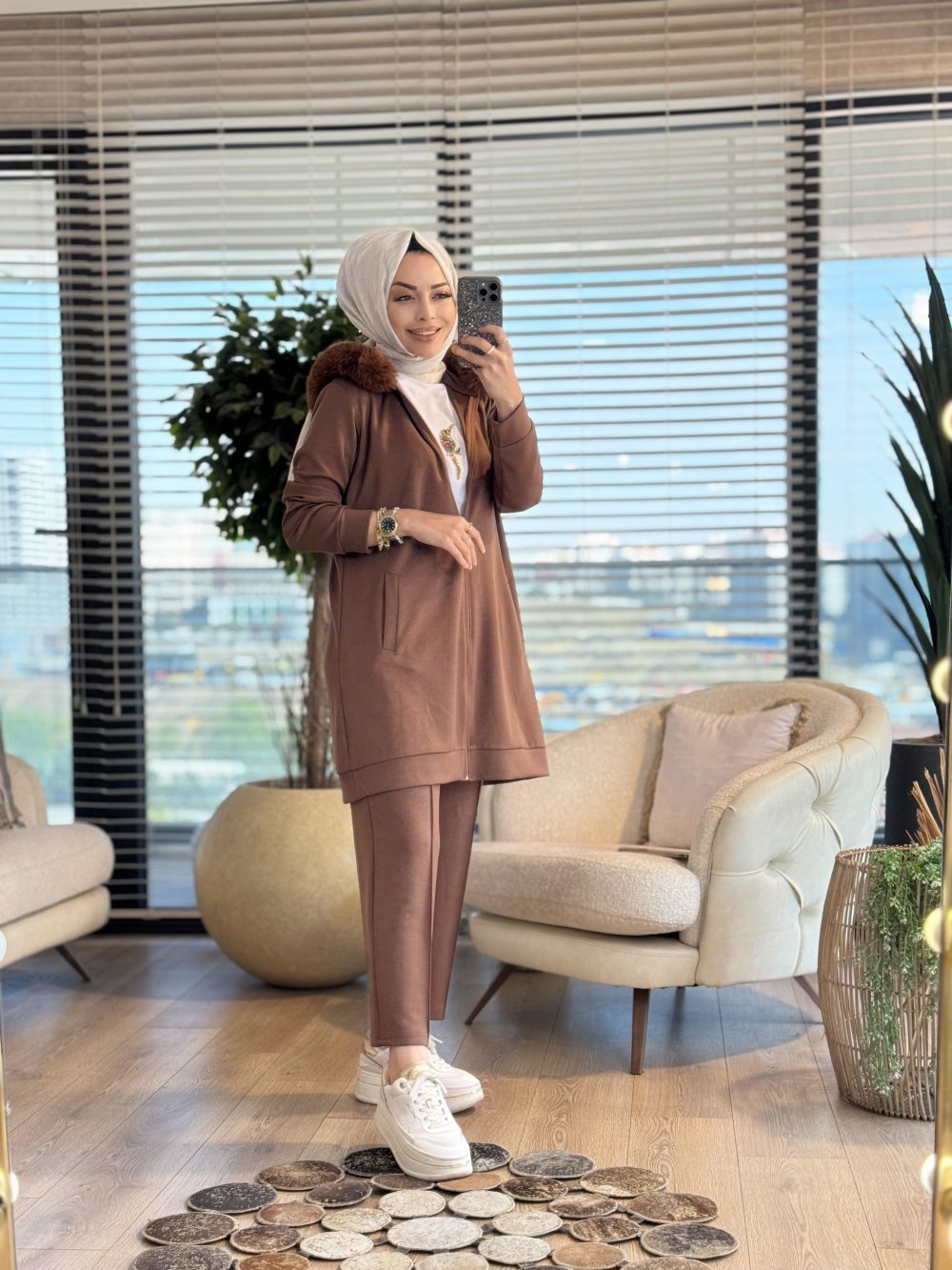 3950 Yaka Kürklü Fermuarlı Takım Kahve