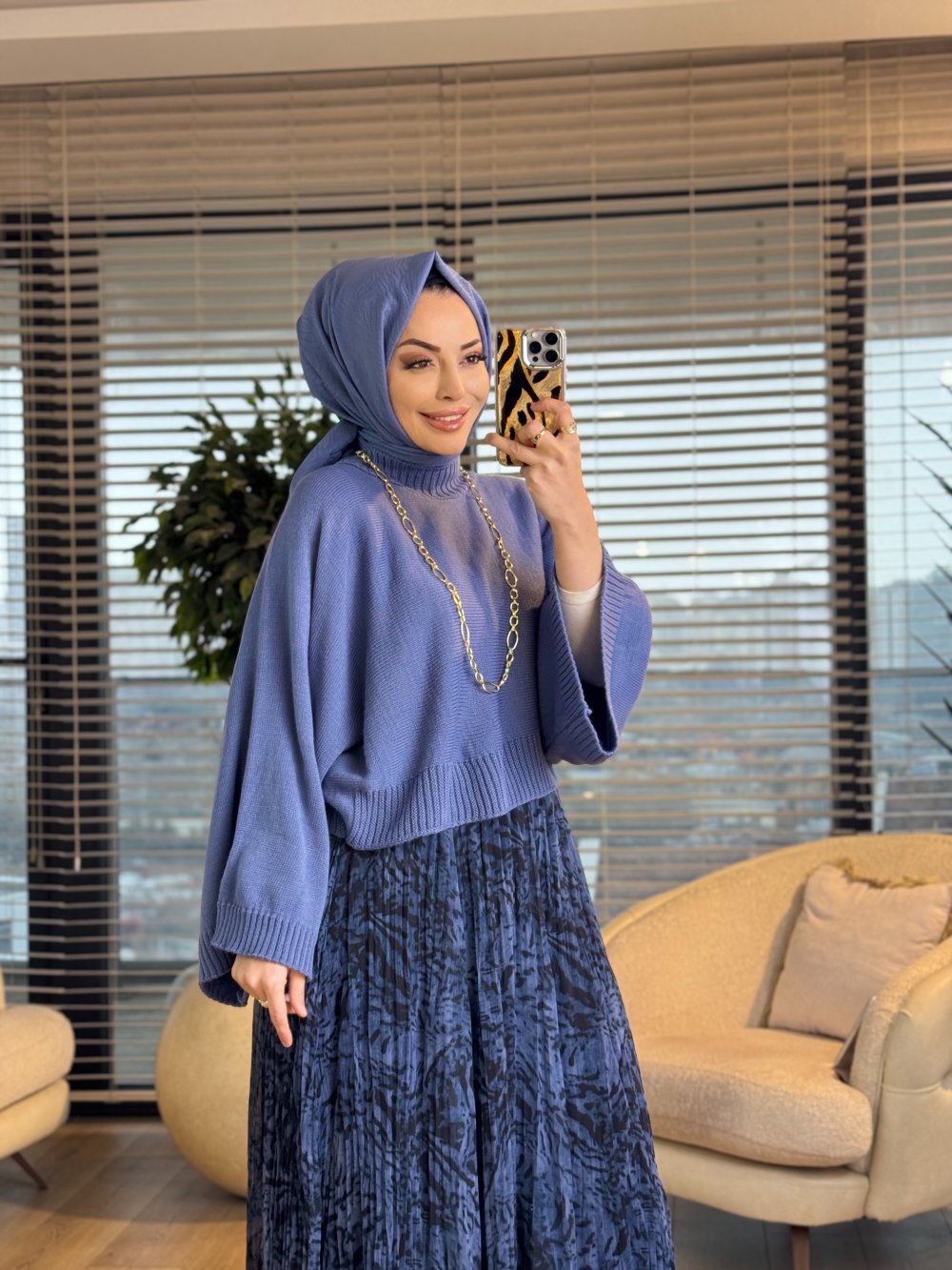 4073 Eteği Şifon Desenli Takım İndigo