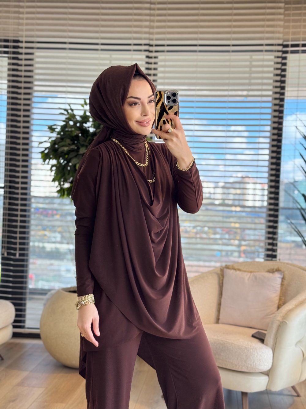 4201 Omzu Pileli Önü Dökümlü Sandy Takım Kahve