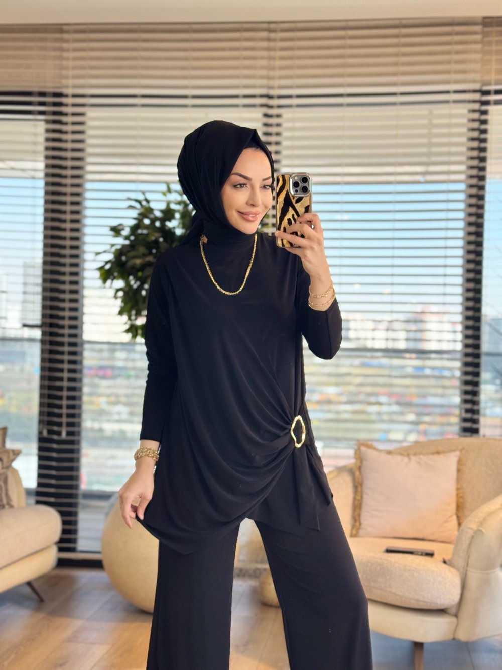 4225 Yanı Toka Büzgülü Pantolonlu Takım Siyah