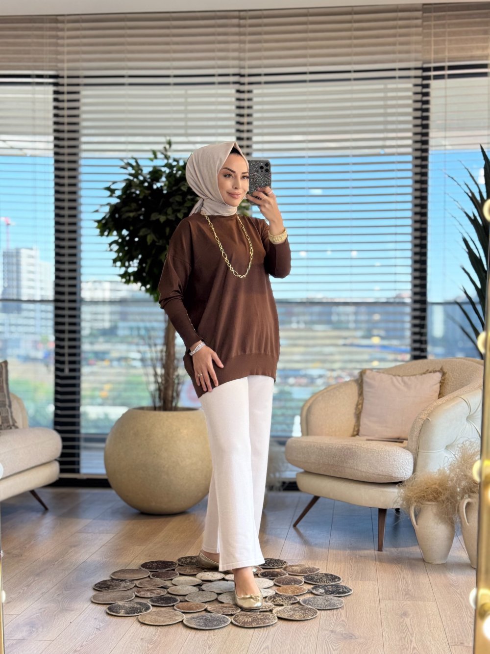 44016 Manşeti Çıtçıtlı Triko Tunik Kahve