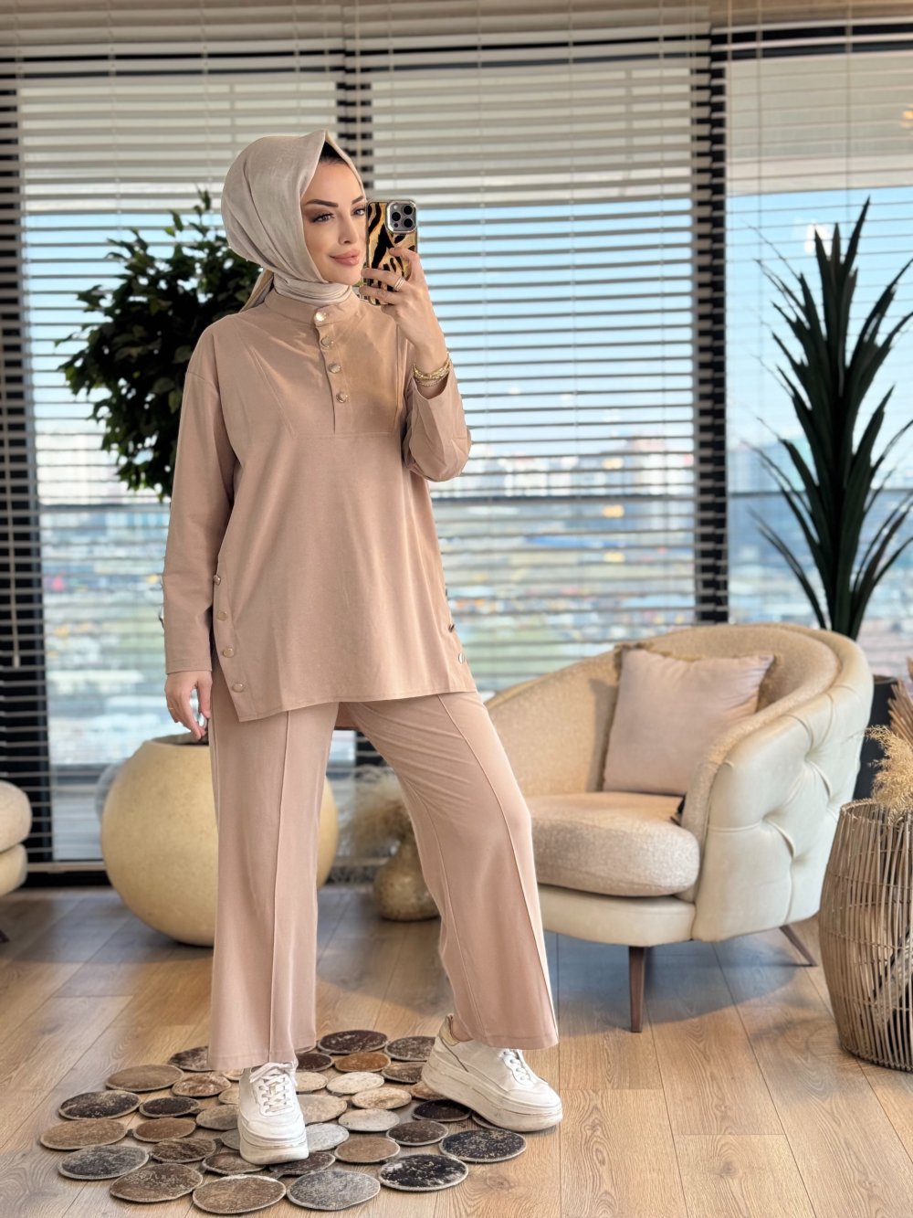 4437 Yanları Ve Patı Düğmeli Takım Bej
