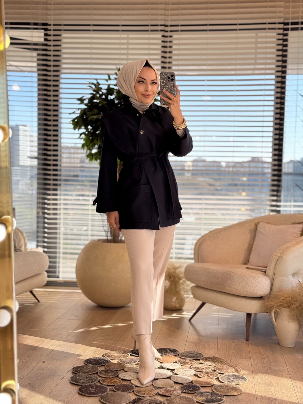 51198 Ön Oval Parça Apoletli Kısa Trenç Siyah